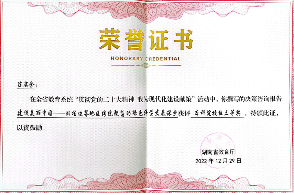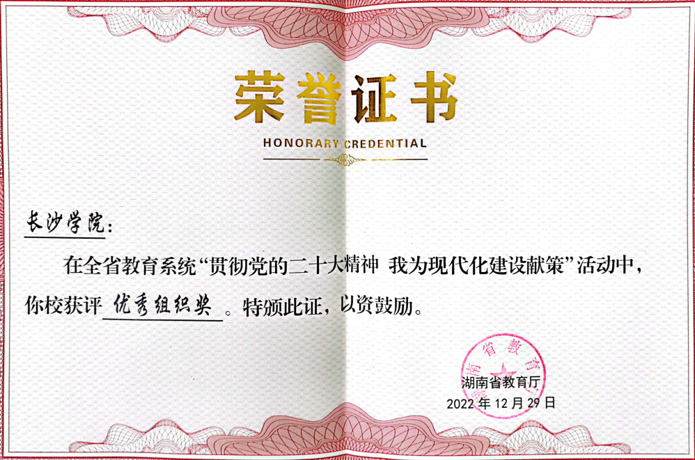 为深入学习宣传贯彻党的二十大精神,我校根据相关文件精神,积极组织全校师生参与了省市学习宣传贯彻党的大精神的一系列活动,由湖南省教育厅组织的"贯彻党的二十大精神我为现代化建设献策"活动是其中之一。学校紧抓机遇,通过动员部署、组团选题、合作研究、专家指导等一系列有组织的科研活动,着力推动了学校新型智库研究,并向省教育厅择优报送了10项决策咨询报告,本次获奖的2项成果即源于此,另有多项成果获得好评。
