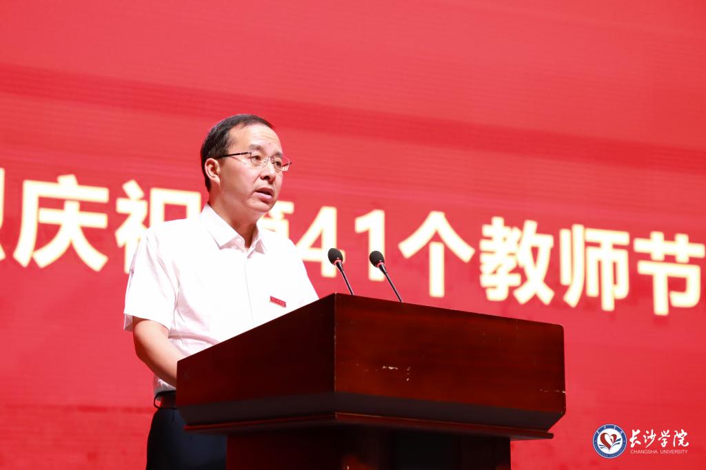 9月10日下午,我校在学生活动中心举行“以教育家精神铸魂强师,谱写教育强国建设华章”庆祝第41个教师节暨表彰大会。党委书记杨小云出席大会并讲话,校长陈赤平主持大会,全体校领导,全体科级以上干部,2025年度师德标兵、2024-2025学年获表彰奖励教师、荣休教师代表、新进教师,教研室、实验室主任以及在职教职工、学生代表等600余人齐聚一堂,共同庆祝第41个教师节的到来。